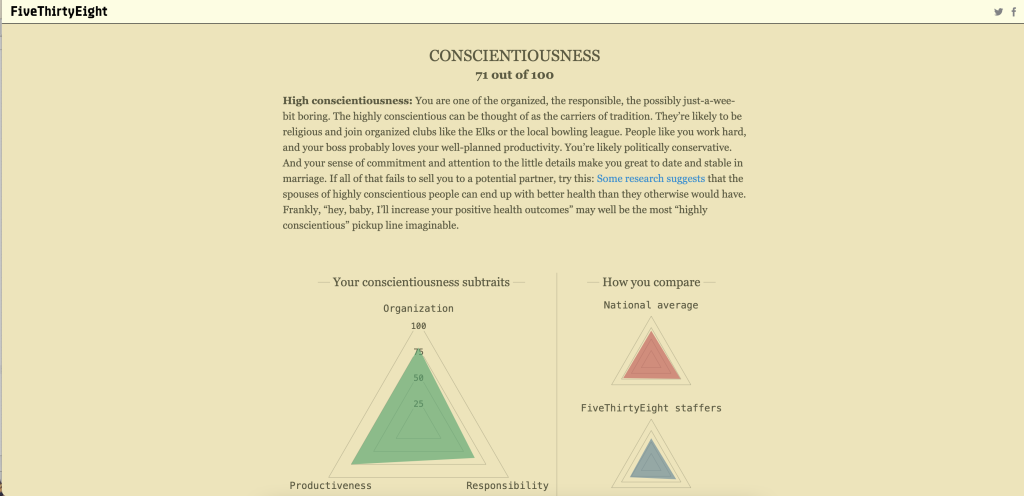 Big Five a devenit un indicator popular al personalității care poate fi folosit pentru ca indivizii să învețe despre ei înșiși și despre punctele lor forte, sau poate fi folosit de organizații pentru a estima succesul ei. DAcă nu ți-ai făcut până acum Testul Big Five, iată unul gratuit pe care îl poți completa online. Pe baza răspunsurilor tale, dintr-un spectru de la zero la 100, vei afla unde te încadrezi la cele cinci trăsături de personalitate mari: