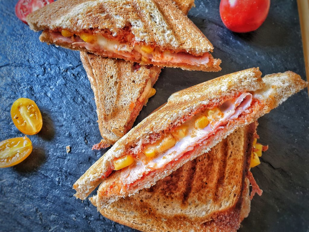 Feliile de pâine le ungem cu bulion/suc de roșii concentrat, adăugăm șuncă, porumb și mozarella rasă (sau cașcaval). Punem felia de pâine deasupra (pe care am uns-o cu bulion) și îl punem la sandwich maker pentru câteva minute, până se rumenește bine. Sandwich-ul se taie pe diagonală și se servește fierbinte cu legume alături sau pur și simplu, doar cu poftă, este suficient.