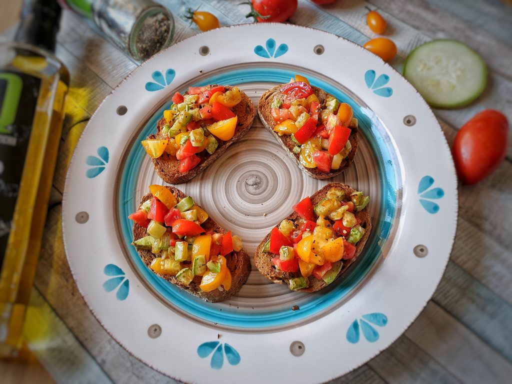 Ce ziceți de o gustare colorată, care nu cade greu la stomac și care îți bucură privirea în același timp? O gustare veselă, ca o ploaie caldă de toamnă. Noi am folosit două soiuri de roșii, respectiv roșii normale și roșii galbene plus dovlecel. Puțin usturoi pus peste feliile de pâine prăjită au făcut aceste mini sandvișuri-uri sa fie și mai aromate. Aceste bruschete îți vor face dimineața mai frumoasă, pe cuvânt!