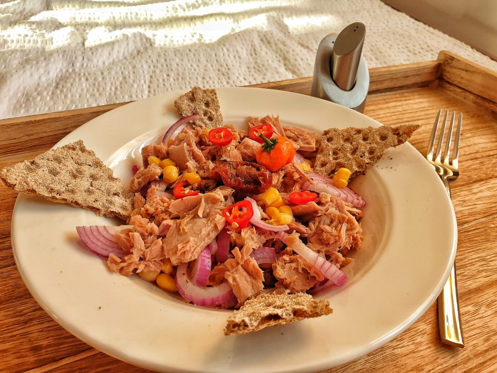 Da, e simplu să deschizi dimineața o conservă de ton, niște zeamă de lămâie deasupra și gata masa. Nu-ți ia foarte mult timp să pregătești o salată simpatică, pe cuvânt. Pur și simplu eu iubesc tonul la conservă. Îmi place cel mai mult atunci când îl mănânc să-l asociez cu porumb. Această salată poate fi consumată atât dimineața, la micul dejun, dar poate înlocui cu succes chiar și masa de prânz sau cina.