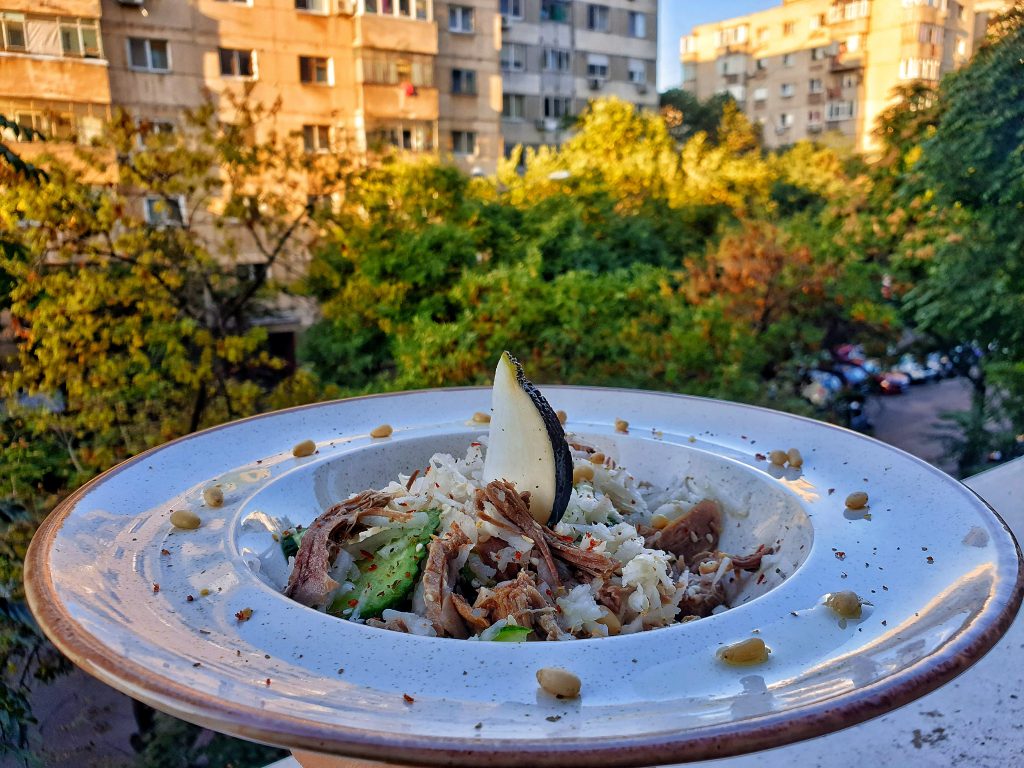 - Curățăm ridichea neagră de coajă și o dăm pe răzătoarea mare. Adăugăm fâșii de carne fiartă (mie mi-a rămas de la o supă), un castravete tăiat în rondele fine și semințe de susan.