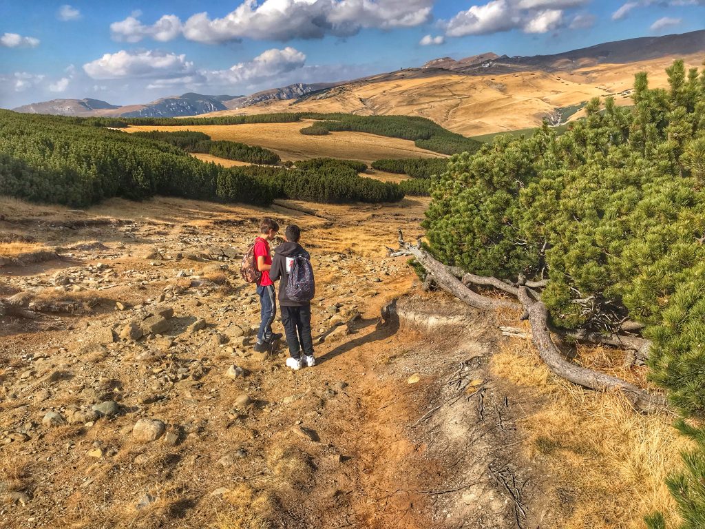 În fine, pornim, dar prima parte a traseului este mai dificilă, în sensul că e ușor abruptă și trebuie să pășești cu atenție ca pe niște scări. Prima dramă vine când pică și își murdăresc de pământ hainele. Din acel moment totul este groaznic. Nemulțumirea este exprimată fără oprire, în toate modurile colorate posibile. Și când zic fără oprire, nu exagerez. Timp de 4 ore. Ca să fiu mai elocventă, imaginează-ți liniștea din vârf de munte, pe care o remarcă inclusiv copiii. Ei bine, timp de 4 ore, ea nu mai există. Și urșii cred că au dat bir cu fugiții (n.r. știu că pe platou nu vin urșii :)) Dar oamenii care trec ocazional pe lângă noi, se uită ca la urs.