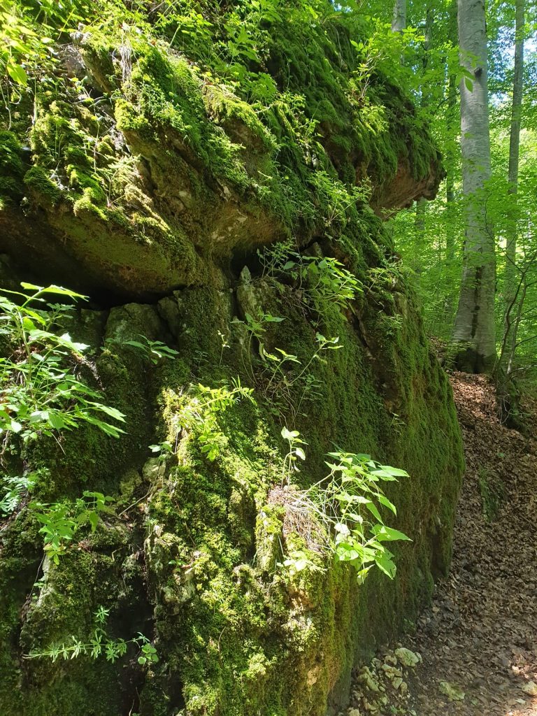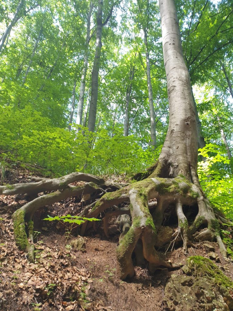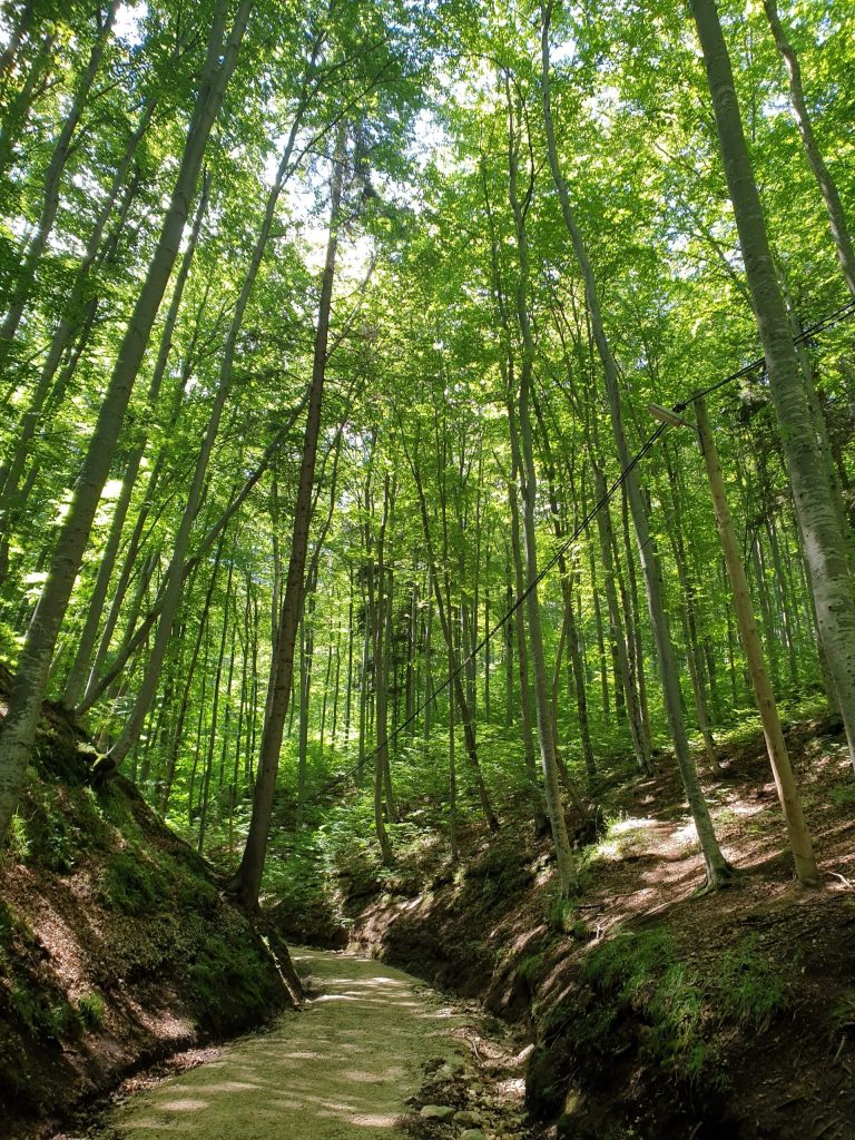 Puteți merge pe drumul cu pietre, sau puteți opta pentru drumul imediat de lângă, cu scări de lemn. Noi am mers pe drumul principal, cel pietruit. Vestea bună este că peisajul este superb până acolo! Eu m-am bucurat de imaginea soarelui care apărea printre imenșii arbori, de rădăcinile deosebite ale unora dintre ei, de plante, de flori, insecte, de sunetul păsărilor…