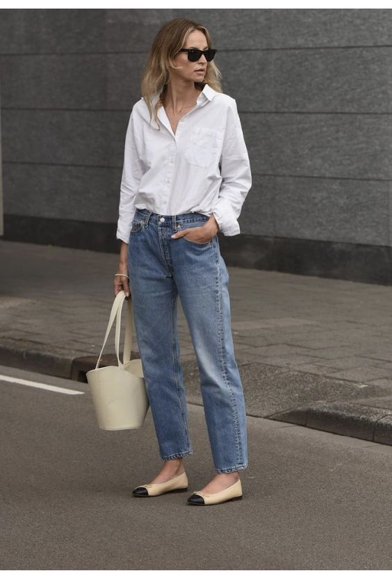 Ceea ce este foarte important la această ținută este modelul de jeans pe care îl poți … preferabil să nu fie rupți și nici foarte decolorați. Poți alege o pereche de jeans albastru mai închis sau mediu, cu talia înaltă, croială dreaptă, conică sau un pic evadată. Evită jeanșii mulați.
