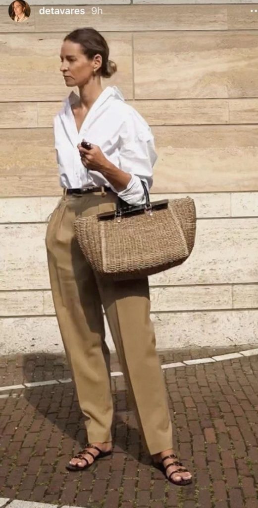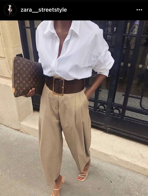 O astfel de ținută poate părea foarte aranjată dar asta este numai pentru că toate aceste culori deschise aduc un sentiment de rafinament și eleganță. În realitate, vorbim de un simplu top bej și o pereche de pantaloni. Iar dacă adaugi două accesorii aurii, totul va părea foarte stilizat. O poșetă structurată de piele în nuanța camel va transforma întreagă ținută într-un care emană lux. Dar nu și opulență :)))