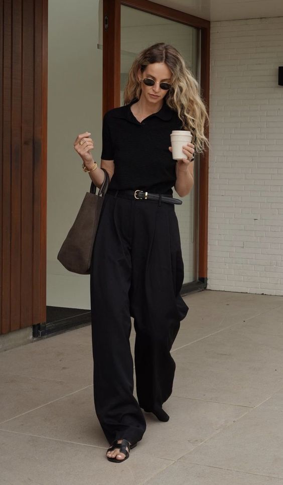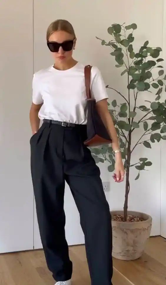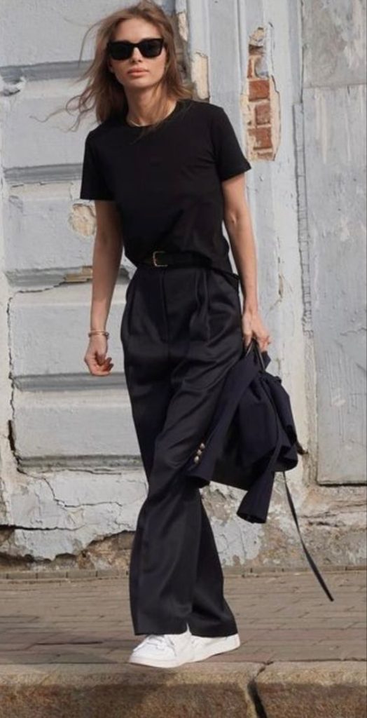 Pantalonii negri pot fi uneori prea serioși, prea office, prea … fix cum nu ai chef să te simți. Dar ei pot fi ”potoliți” dacă sunt purtați în combinații vestimentare casual cu un tricou alb sau în dungi alb/negru. Sau cu un tricou simplu … negru. Accesorizarea cu cercei aurii, o brățară voluminoasă și o poșetă camel, va transforma această ținută într-una rafinată și elegantă, dar relaxată. IAr în picioare poți purta fără grijă teniși albi. 🙂