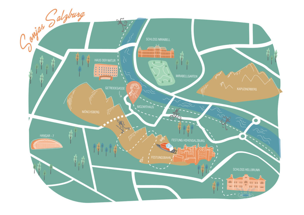- Viața activă. Am senzația că Salzburgul te vrea în formă pentru că, indiferent de activitățile pe care le preferi, n-ai cum să scapi de ceva mișcare. La fiecare colț de stradă există câte un centru de închiriat biciclete. Și, ce chestie, chiar ai pe unde să le folosești (178 km de trasee ciclistice în Salzburg și imediata apropiere aș zice că nu sunt de colo), în siguranță, pentru că șoferii austrieci sunt foarte politicoși și vor acorda tot timpul prioritate bicicliștilor. Poți face plimbări sau alergări lungi pe malul Salzach-ului.