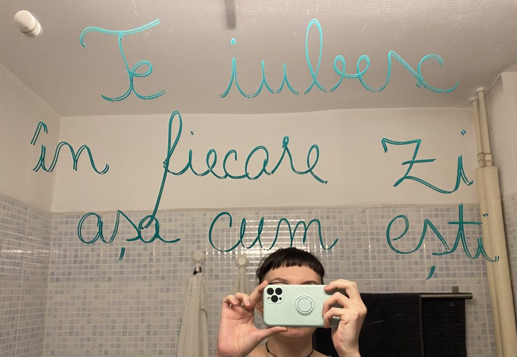 De la o sesiune de terapie unde am învățat să nu mai fiu așa pretențioasă cu mine. Să accept că gândurile vin și pleacă. Sau că un coș se vindecă în câteva zile. Și că primul rid pe frunte nu e o tragedie – doar nu mi se mai cere buletinul la supermarket când îmi cumpăr o sticlă de vin. Atunci mi-am scris pe oglinda din baie asta: „Te iubesc în fiecare zi așa cum ești”. Un reminder zilnic, pe care îl văd dimineața, ciufulită și cu pijamaua șifonată. Un reminder sub care mă dau cu rimel și blush. Sub care mă demachiez. Un reminder pe o oglindă care nu este mereu curată, dar fix reminderul ăsta mă ajută să accept că e OK să nu am oglinda mereu curată.