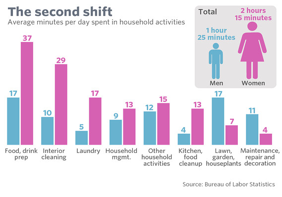 Statisticile la nivel mondial arată că activitățile neremunerate, adică cele casnice să le spunem, sunt într-o cantitate muuult mai mare preluate de femei. Cam așa arată proporțiile:
