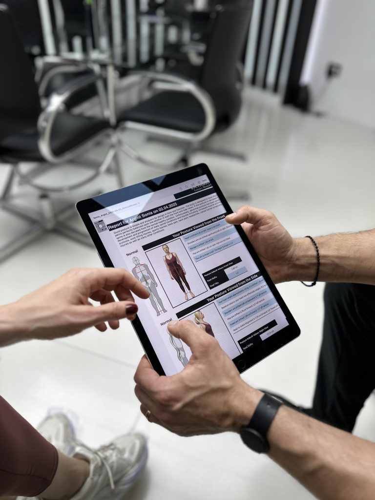 A doua investigație – și cea despre care scriu acum mai pe larg – este testarea posturală. O procedură simplă, non-invazivă, care presupune câteva fotografii și câteva minute de așteptare. Rezultatul? Un raport detaliat, interpretat de fiziokinetoterapeutul clinicii, Emil Peptea. Am aflat astfel că postura corpului meu este una echilibrată, cu mici asimetrii – absolut normale. Singura zonă unde trebuie să fiu mai atentă este zona cervicală, unde – și recunosc că mă regăsesc complet – statul cu ochii în telefon sau orele petrecute în fața computerului își pun amprenta. Acum știu exact ce am de corectat și ce pot preveni din timp.