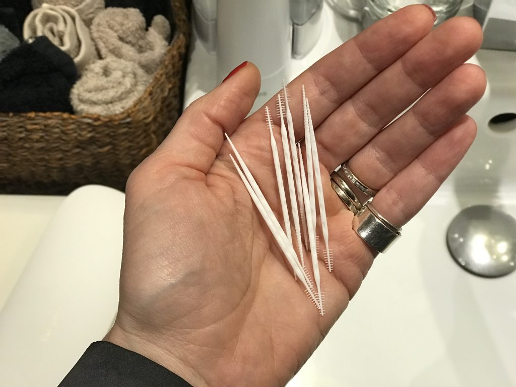 2. Periuță interdentară este practic un fel de scobitoare cu niște peri/zimți dintr-un material special. Aceste periuțe au o formă specială, care permite utilizarea lor în locurile greu accesibile din cavitatea bucală. Sunt absolut fantastice mai ales după o masă în care ai mâncat carne.