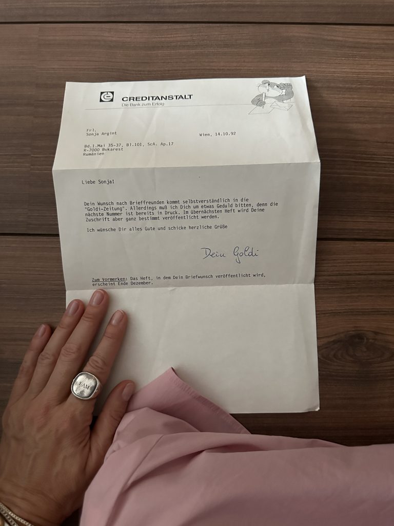 Nu știu dacă am mai povestit, dar în 1990, când am ieșit prima dată din țară, în Austria, la Viena, mi-au pica ochii pe revista pentru copii ”Goldi-Zeitung” care pe paginile de final avea secțiune de anunțuri pentru corespondență. Atât de mult mi-a plăcut încât am trimis o scrisoare către redacție, solicitând să-mi publice anunțul că sunt în căutare de ”Brieffreunde” (corespondenți). În scurt timp aveam zece noi prieteni la distanță, cu care făceam schimb de informații, povești și tot felul de alte lucruri gen timbre. A fost o perioadă prin care mi-am dezvoltat enorm vocabularul în limba germană și mi-am lărgit perspectiva asupra vieții mele de adolescentă la momentul respectiv.
