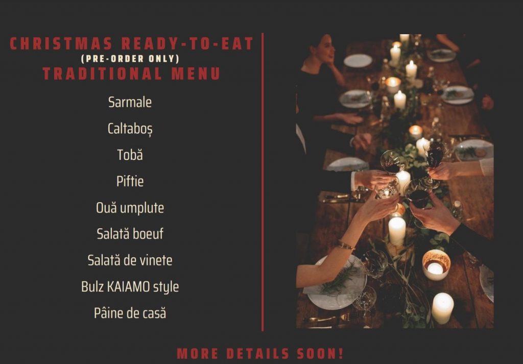 KAIAMO vine cu o selecție de preparate care clar satisfice toate gusturile. Spun asta pentru că Chef Radu Ionescu a pregătit trei variante de pachete gourmet de Crăciun și două de meniuri – unul tradițional și altul internațional. Vin fiert, cozonac, brânzeturi artizanale, caltaboș, tobă, piftie, murături și zacuscă de casă, salată boeuf, bulz, salată de vinete, pâine de casă și diverse tipuri de cărnuri sunt doar o parte din preparatele gătite cu dichis care abia-și așteaptă mușterii.