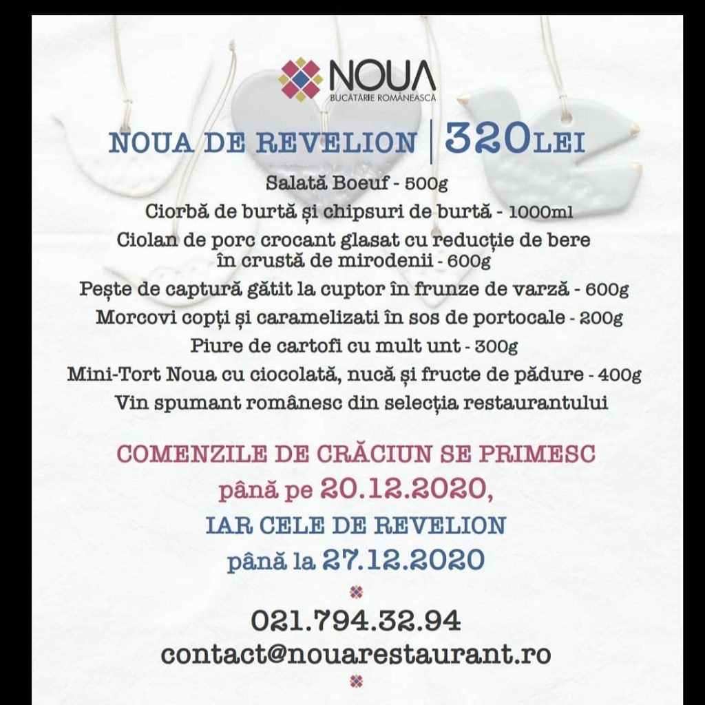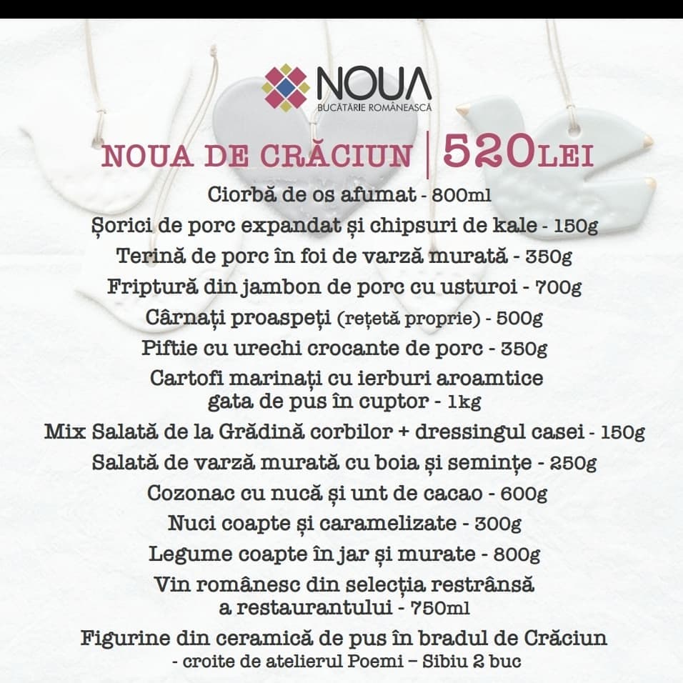 NOUA Bucătărie Românească prinde contur cu ajutorul mâinilor dibace ale lui Chef Alex Petricean. Hai să-ți fac poftă cu câteva preparate din pachetul de Crăciun! Cârnați proaspeți făcuți după o rețetă proprie, șorici de porc expandat și chipsuri de kale, terină de porc în foi de varză murată, legume coapte în jar și murate, nuci coapte și caramelizate, vin românesc din selecția restrânsă a restaurantului și multe altele. Pachetul vine și cu 2 figurine din ceramică de pus în brad, meșteșugite la Sibiu de atelierul Poemi.