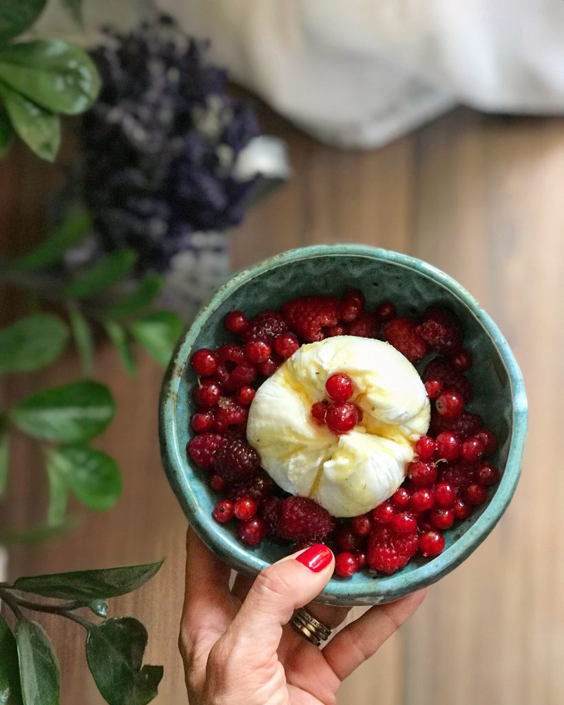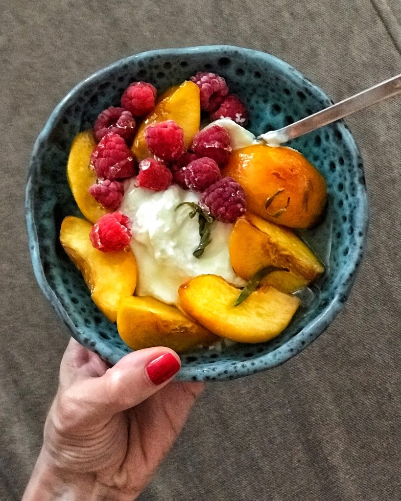 Ricotta stoarsă de zeamă, cu coacăze roșii, zmeură și miere de cimbru.Celebrele frigănele sau french toast alături de fructele preferate (zmeură, piersici, caise, mure… ) și cu miere în loc de zahăr pudră.Iaurt grecesc cu piersici infuzate în miere cu tarhon și puse pe grătar, zmeură și încă un pic de miere de lavandă.