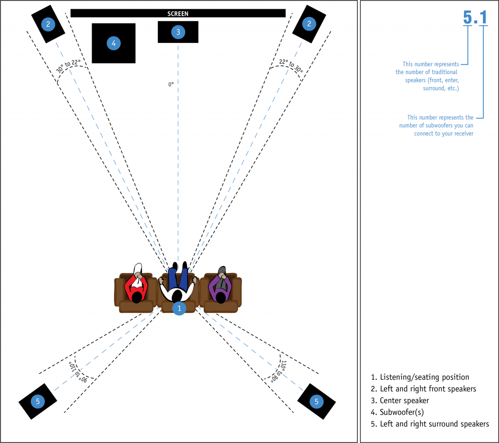 Utilizatorul, care stă comod pe canapea, trebuie să fie plasat în interiorul unui trapez cu baza mică în față lui, care grupează: Televizorul, o boxa Centrală (care preia vocile în general – C), o boxa Față Dreapta (în engleză Front Right – FR), o boxa Față Stânga ( Front Left – FL), un Subwoofer (SW).