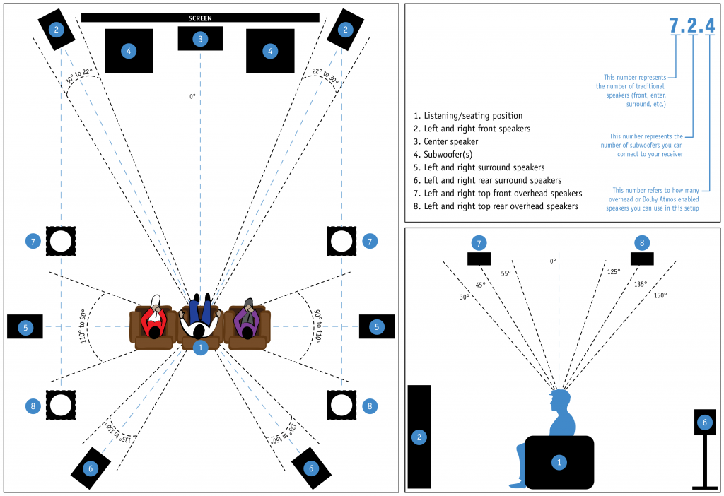 Adică, la sistemul 7.2 apar în plus față de 5.1, doi sateliți pe linia mediană a trapezului și un al doilea subwoofer, iar la sistemul Dolby Atmos apar în plus față de 7.2, încă 4 sateliți pe tavan, deasupra locului ideal de vizionare.