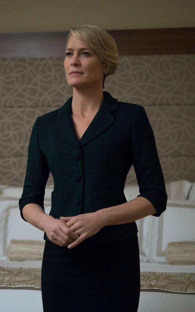 Garderoba impresionantă a actriței Robin Wright în rolul lui Claire Underwood în House of Cards a atras atenția fanilor iar piesele vestimentare pe care le poartă în serial evoluează o dată cu poziția pe care o ocupă. Se spune că ar trebui să te îmbraci pentru jobul pe care ți-l dorești, iar doamna Underwood este un exemplu grăitor de îmbrăcăminte de putere. Când revine ca Prima Doamnă, noul ei rol a fost întruchipat și în ținutele ei.