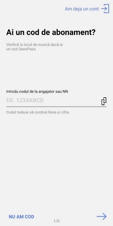 Inițial, aplicația te întreabă dacă ai un cod de abonament, iar această facilitate este destinată companiilor: orice companie care utilizează un card Mastercard beneficiează de 50% reducere la achiziția de beneficii medicale pentru angajații săi.